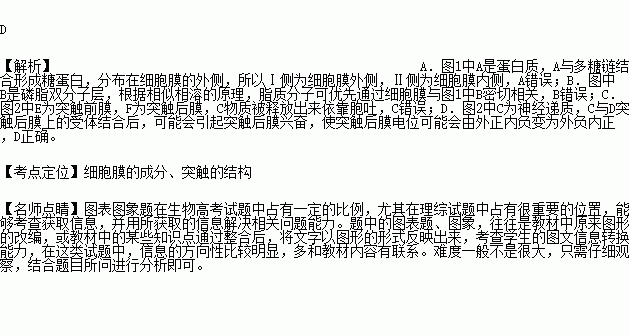 D.图2中C为神经递质,C与D结合后,突触后膜电位可能会由外正内负变为外负内正