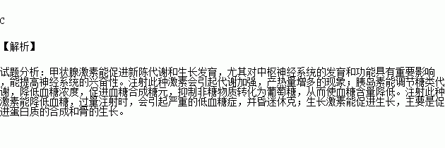 科研人员分别给三只大白鼠注射了A、B、C三种激素后,观察到的相应反应是:A可引起低血糖,甚至昏迷;B促进蛋白质的合成,并使软骨生长明显;C使呼吸、心率加快,并使体内产热量增加。据此判断激素A、B、C的化学名称依次是