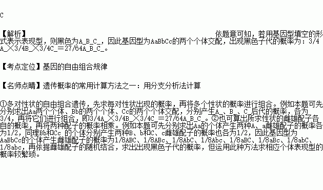 黑色素。则基因型为AaBbCc的两个个体交配,出现黑色子代的概率为 ( )