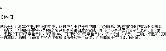 D.细胞①的前一时期,生物膜的种类减少,核仁逐渐解体
