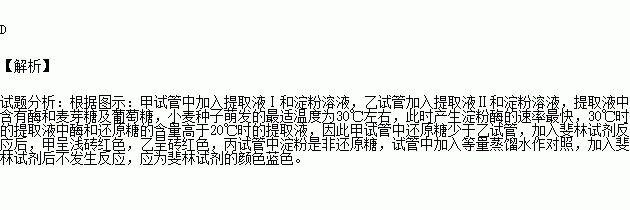 小麦种子萌发时产生淀粉酶,将淀粉水解为麦芽糖、葡萄糖等。小麦种子萌发的最适温度为30℃左右。取适量小麦种子在20℃和30℃培养箱中培养4天后,做如下处理:在3支试管中加入等量斐林试剂并加热至50℃左右,摇匀后观察试管中的颜色。结果是