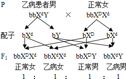 £¨2£©¢ó8»¼ÒÒ²¡£¬²»»¼¼×²¡£¬Æä»ùÒòÐÍΪbbXdY£¬Ò»±íÏÖÐÍÕý³££¬µ«Æä¸¸Ç×»¼ÓÐÒÒ²¡µÄÅ®ÐԵĻùÒòÐÍΪbbXDXd£¬¶þÈ˽á»é×ÓÅ®»¼²¡¸ÅÂÊΪ$\frac{1}{2}$£¬ÒÅ´«Í¼½âÈçÏ£º![]()