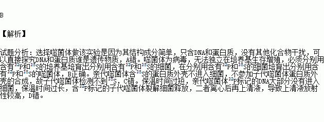 ·Ö±ð½«º¬ÓÐ32PºÍ35SµÄT2ÊɾúÌåÓë²»º¬·ÅÉäÐԵĴ󳦸˾ú»ìºÏ£¬¾¹ý±£Î¡¢½Á°è¡¢ÀëÐÄ£¬ÔÙ½«³Áµí³öµÄ´ó³¦¸Ë¾ú¼ÌÐøÔÚ²»º¬·ÅÉäÐÔÎïÖʵÄÅàÑø»ùÖÐÅàÑø£¬²¢¶ÔÆäÊͷųöµÄ×Ó´úT2ÊɾúÌå½øÐмì²â¡£ÏÂÁжԸÃʵÑéµÄ¹ý³Ì¼°½á¹û·ÖÎöÕýÈ·µÄÊÇ£¨ £©