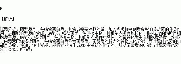 嗜盐菌是一种能在高浓度盐溶液中生长的原核生物,该菌中有一种结合蛋白质称为菌紫质,菌紫质能将光能转换成化学能。下列叙述正确的是( )