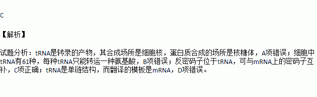 D.tRNA是双链结构,能为翻译过程提供模板