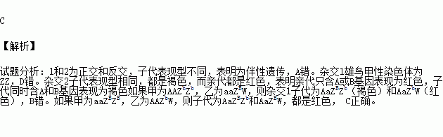 鸟类的性别决定为ZW型。某种鸟类的眼色受两对独立遗传的基因(A、a和B、b)控制。甲、乙是两个纯合品种,均为红色眼。根据下列杂交结果,推测杂交1的亲本基因型是( )