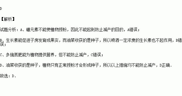 大田里的油菜在盛花期由于一场大雨影响了正常授粉,为防止减产可采取的补救措施是( )