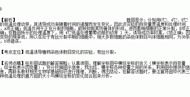 某研究小组开展了“用低温诱导培育四倍体葡萄”的实验。选取二倍体葡萄(2N=38)幼苗若干,随机分组,每组30株,用不同低温处理幼芽,得到实验结果如下图所示。下列有关叙述中, 错误的是( )