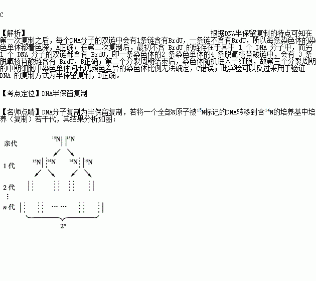 BrdU能代替胸腺嘧啶脱氧核苷掺入到新合成的DNA链中。若用姬姆萨染料染色,在染色单体中,DNA只有一条单链掺有BrdU则着色深;DNA的两条单链都掺有BrdU则着色浅。将植物根尖分生组织放在含有BrdU的培养液中培养一段时间,取出根尖并用姬姆萨染料染色,用显微镜观察染色体的染色单体的颜色差异。下列相关叙述不正确的是