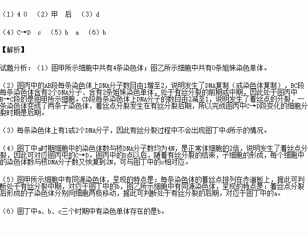 ÏÂͼÖмס¢ÒÒ·Ö±ð±íʾijÖÖÉúÎïϸ°ûÓÐË¿·ÖÁѹý³ÌÖÐijһʱÆÚµÄģʽͼ£¬±û±íʾÓÐË¿·ÖÁѹý³ÌÖв»Í¬Ê±ÆÚÿÌõȾɫÌåÉϵÄDNA·Ö×ÓÊýÄ¿µÄ±ä»¯£¬¶¡±íʾÓÐË¿·ÖÁÑÖв»Í¬Ê±ÆÚȾɫÌåºÍºËDNAÊýÁ¿µÄ¹ØÏµ¡£¾Ýͼ»Ø´ðÏà¹ØÎÊÌ⣺
