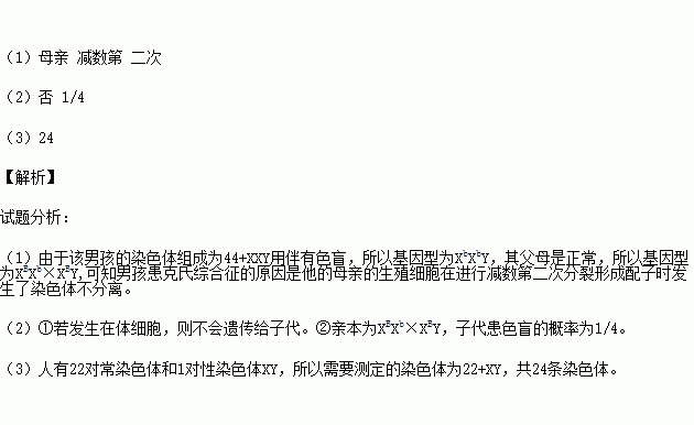 克氏综合征是一种性染色体数目异常的疾病。现有一对表现型正常的夫妇生了一个患克氏综合征并伴有色盲的男孩,该男孩的染色体组成为44+XXY。请回答: