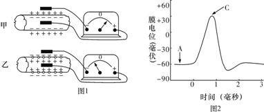 据图分析可知:图1中装置甲测得的电位相当于图2中的 点的电位;图1中装置乙测得的电位相当于图2中的 点的电位,该电位称为 电位,导致这种电位变化的原因