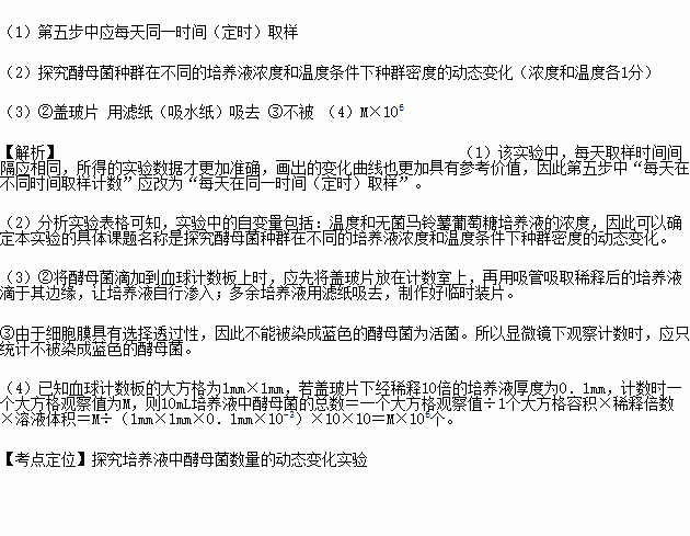 (4)已知血球计数板的大方格为1mm×1mm,若盖玻片下经稀释10倍的培养液厚度为0.1mm,计数时一个大方格观察值为M,则10mL培养液中酵母菌的总数约为 个。