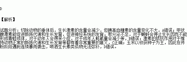 A.切除动物垂体后,动物血液中的生长激素和胰高血糖素都会减少