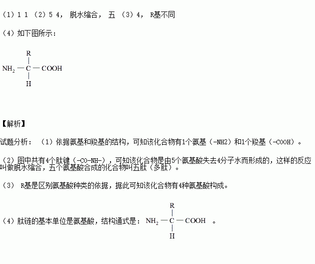 (2)该化合物是由 个氨基酸失去 分子水而形成的,这样的反应叫做 ,该化合物叫 肽。
