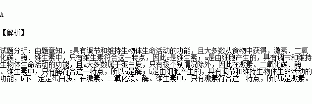 a、b、c三种物质对生物的生理活动都有重要的维持和调节作用。c大多数从食物中摄取,a、b由生物体细胞产生,但b不一定是蛋白质,a是蛋白质成分(极个别情况除外)。则a、b、c依次为( )