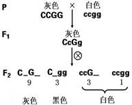 因为每一个体中至少有一个显性C存在,才能显示出颜色来。没有C时,即cc纯合,不论是GG、Gg还是gg都表现为白色。也就是一对隐性基因纯合时(cc),遮盖另一对非等位基因(Gg)的表现。据此,推导上述遗传图解如下: