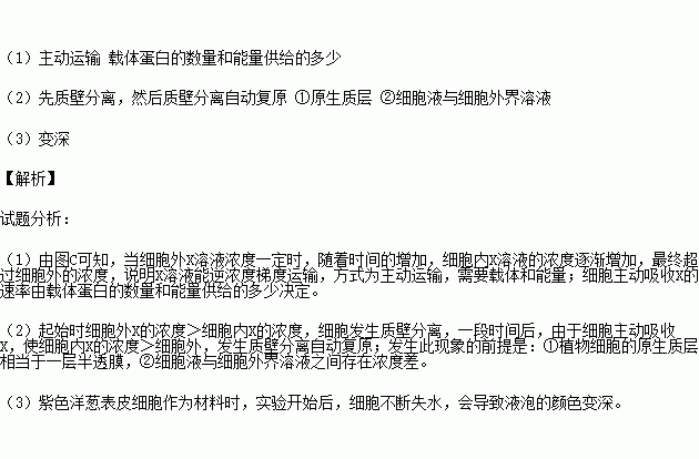 (1)向盖玻片一侧滴加一定浓度的X溶液,在另一侧用吸水纸吸水,使根尖组织周围充满X溶液,用一定的方法检测细胞内X的浓度随时间的变化情况如图C,据图判断物质X进入细胞的方式应该为 ,细胞吸收X的速率由 决定。