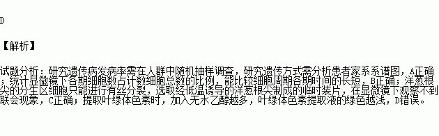 A.研究遗传病发病率需在人群中随机抽样调查,研究遗传方式需分析患者家系系谱图
