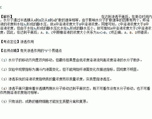 在如图所示的装置中,A、B、C中均为一定浓度的蔗糖溶液,溶液之间均用半透膜隔开,一段时间后达到渗透平衡形成一定的高度差,如图所示,h1>h2,在达到平衡后,A、B、C中蔗糖溶液的浓度大小关系为( )