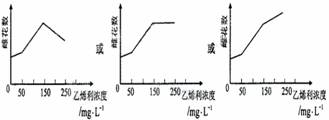 £¨2£©ÓÃÕôÁóˮϡÊÍÒÒÏ©ÀûÈÜÒº£¬ÅäÖóÉ4ÖÖŨ¶È£¨ÒªÇóÔÚ0¡«100mg¡¤L-1¡¢100¡«200mg¡¤L-1¡¢200¡«300mg¡¤L-1Èý¸öÇø¼ä¸÷ÖÁÉÙȡһÖÖŨ¶È£©¡££¨3£©È¡µÈÁ¿ÉÏÊö¸÷Ũ¶ÈÒÒÏ©ÀûÈÜÒº£¬ÓÃÅçºø·Ö±ðÅçÈ÷¸÷×黯¹ÏÓ×ÃçÒ»´Î¡££¨4£©¸÷×é´Æ»¨Êý£¨»ò¸÷×éÿÖêÆ½¾ù´Æ»¨Êý£©¡£ÊµÑé½á¹ûÔ¤²â£ºÈçÅäÖõÄŨ¶ÈΪ0¡¢50¡¢150¡¢250mg¡¤L-1£¬ÕÛÏßͼΪ£º