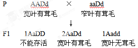 ⑶根据题意,宽叶的基因型为AA、Aa,窄叶的基因型是aa,有茸毛的基因型是Dd(DD幼苗期死亡),无茸毛基因型为dd,且两对基因独立遗传即遵循基因的自由组合定律。①宽叶有茸毛玉米(A_Dd)和窄叶有茸毛玉米(aaDd)进行异株异花传粉,子代只出现两种表现型故可确定亲本基因型分别是AADd和aaDd。②由亲本可知F1个体基因型为2/3AaDd、1/3Aadd,F1个体同株异花授粉即自交理论上F2成熟植株的表现型有宽叶有茸毛(A_Dd)、窄叶有茸毛(aaDd)、宽叶无茸毛(A_dd)、窄叶无茸毛(aadd)四种表现型;因F1个体中只有2/3AaDd自交后代中会出现高产抗病(即AaDd宽叶有茸毛)个体,故F2成熟植株中高产抗病植株概率为2/3×1/2Aa×2/3Dd=2/9。