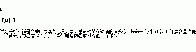 番茄幼苗在缺镁的培养液中培养一段时间后,与对照组相比,其叶片光合作用强度下降,原因是( )