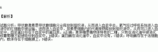 A.甲状腺激素、氧气、尿素、血浆蛋白