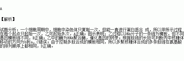 A.一个细胞周期中,甲所示过程在每个起点只起始一次,乙可起始多次