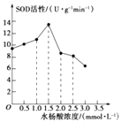 【解析】解:(1)本实验是“水杨酸对水稻幼苗抗冷性的影响”的实验,自变量是水杨酸的浓度,因变量是SOD的活性,分析表格可知,第2组实验与第1、2~8组实验形成对照,根据实验设计时的单一变量原则和对照原则,可知①是蒸馏水浇灌,②是5℃.其的作用是作为对照组,实验设计时每组取50株水稻幼苗,而不是1株,目的是求平均值避免偶然性,减少误差,使实验结果更准确.(2)分析表格可知,本实验的自变量是温度和水杨酸的浓度,其他可能影响实验结果的变量都是无关变量,如蒸馏水和水杨酸的浇灌量、光照强度、培养时间、幼苗的发育情况等.(3)分析表格知,组别1和2的自变量是温度,温度降低,SOD活性升高,抗冷性强.组别2~8的自变量是水杨酸的浓度,组别2~8可得到的结论是在一定范围内随水扬酸溶液浓度的增加,水稻幼苗的抗冷性增强;当水扬酸溶液浓度增加到一定程度时,水稻幼苗的抗冷性开始减弱.(4)在5℃的冷胁迫下,2.0mmol/L的水杨酸对水稻幼苗抗冷性影响是减弱.(5)绘图时横轴表示水杨酸的浓度,纵轴表示SOD活性,根据表格数据描点连线即可,具体见答案. 所以答案是:(1)蒸馏水浇灌 5℃ 对照组 求平均值避免偶然性,减少误差,使实验结果更准确;(2)温度 水杨酸的浓度 蒸馏水和水杨酸的浇灌量、光照强度 培养时间、刚开始幼苗的发育情况等;(3)环境温度降低时,水稻幼苗自身可增强抗冷性 在一定范围内,随水杨酸溶液浓度的增加,水稻幼苗抗冷性增强 当水杨酸溶液浓度增加到一定程度时,水稻幼苗抗冷性开始减弱(或水杨酸对水稻幼苗抗冷性的影响具有两重性,浓度为1.5 mmol/L左右的水杨酸溶液增强水稻幼苗抗冷性的效果最好);(4)减弱;(5)如图所示![]()