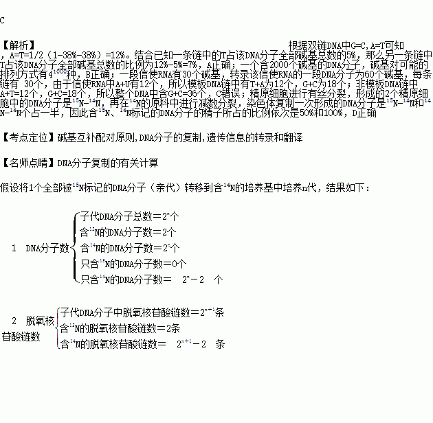 A.某双链DNA分子中,G占碱基总数的38%,其中一条链中的T占该DNA分子全部碱基总数的5%,那么另一条链中T占该DNA分子全部碱基总数的比例为7%