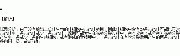 在对某二倍体生物镜检时发现体细胞中有29条染色体,你认为下列分析有道理的是 ①亲代细胞在减数分裂形成配子时多了一条染色体 ②亲代细胞在减数分裂形成配子时少了一条染色体 ③亲代细胞在减数分裂时没有形成纺锤体 ④亲代细胞在减数分裂时,着丝点没有分裂 ⑤该生物受精卵分裂时,有一组姐妹染色单体移向同一极⑥该生物受精卵分裂时,没有形成纺锤体
