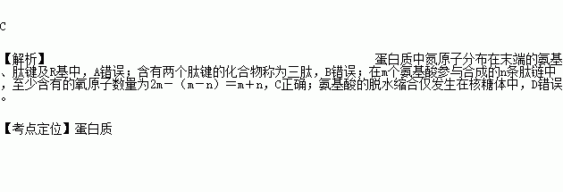 C.在m个氨基酸参与合成的n条肽链中,至少含有m+n个氧原子