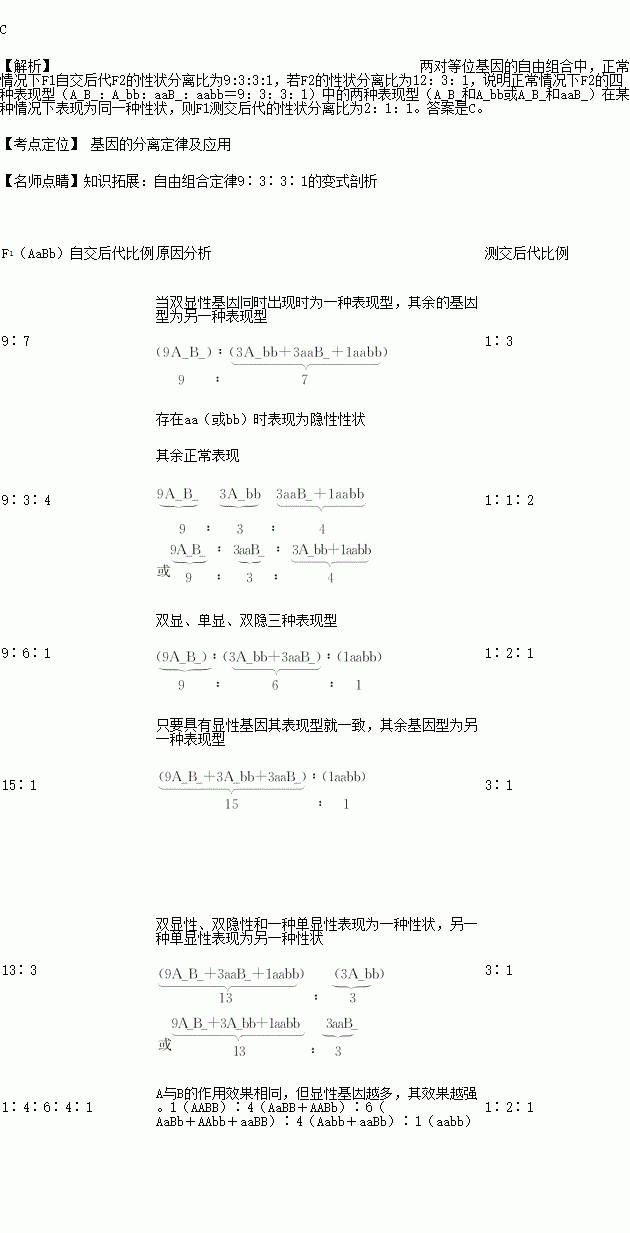 在两对等位基因自由组合的情况下,F1自交后代的性状分离比是12∶3∶1,F1测交后代的性状分离比是