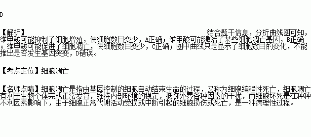 维甲酸(RA)处理未分化的外胚间充质干细胞后,细胞凋亡的数量明显增加,正常细胞数量变化情况如图所示。分析图中曲线可知维甲酸可能的作用不包括