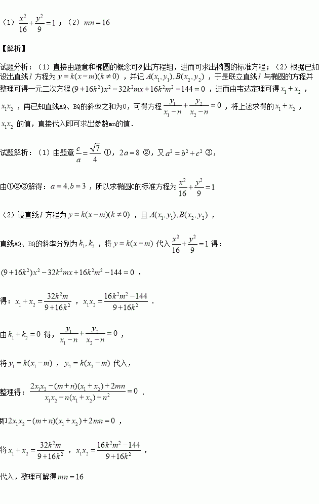,直线AQ,BQ的斜率之和为0,求mn的值.