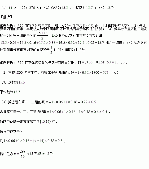 (1)若成绩小于15秒认为良好,求该样本在这在这次百米测试中成绩良好的人数;