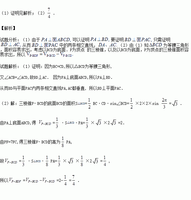 (Ⅱ)若侧棱PC上的点F满足PF=7FC,求三棱锥P﹣BDF的体积.