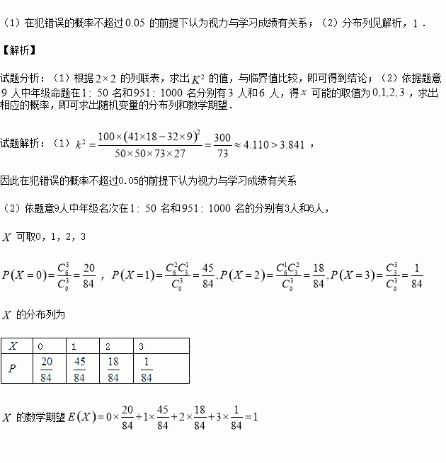 ijѧУÑо¿ÐÔѧϰС×é¶Ô¸ÃУ¸ß¶þѧÉúÊÓÁ¦Çé¿ö½øÐе÷²é£¬Ôڸ߶þµÄÈ«Ìå1000ÃûѧÉúÖÐËæ»ú³éÈ¡ÁË100ÃûѧÉúµÄÌå¼ì±í.ѧϰС×é³ÉÔ±·¢ÏÖ£¬Ñ§Ï°³É¼¨Í»³öµÄѧÉú£¬½üÊӵıȽ϶࣬ΪÁËÑо¿Ñ§ÉúµÄÊÓÁ¦Óëѧϰ³É¼¨ÊÇ·ñÓйØÏµ£¬¶ÔÄê¼¶Ãû´ÎÔÚ