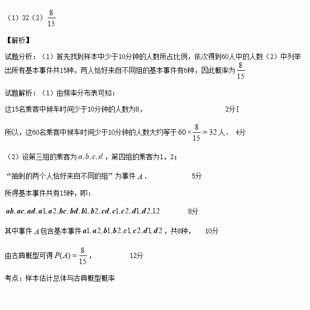 (12分)为调查乘客的候车情况,公交公司在某站台的60名候车乘客中随机抽取15人,将他们的候车时间(单位:分钟)作为样本分成5组,如表所示: