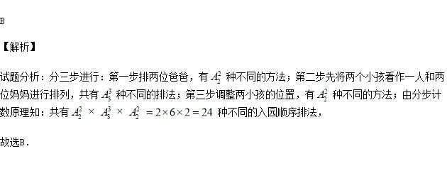张、王两家夫妇各带1个小孩一起到动物园游玩,购票后排队依次入园。为安全起见,首尾一定要排两位爸爸,另外,两个小孩一定要排在一起,则这6人的入园顺序排法种数共有( )