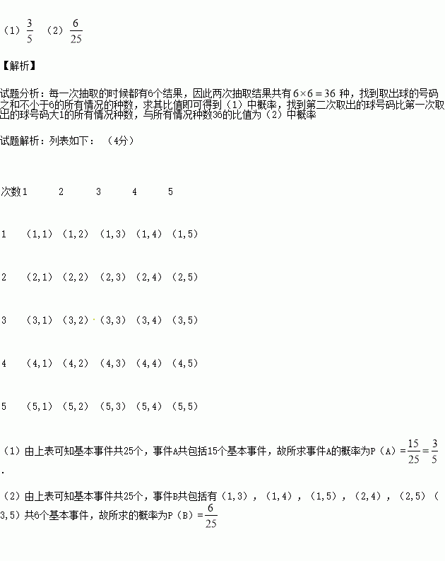 (本小题满分12分)一个盒子中装有5个编号依次为1、2、3、4、5的球,这5个球除号码外完全相同,有放回的连续抽取两次,每次任意地取出一个球.