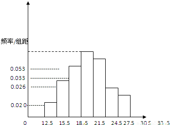 (3)数据在[15.5,18.5)的频率是0.16,数据在[18.5,21.5)的频率是0.18,数据在[21.5,24.5)的频率是0.22,