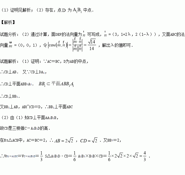 (本小题满分12分)如图所示,在三棱柱ABC-A1B1C1中,AC⊥BC,AB⊥BB1,AC=BC=BB1=2,D为AB的中点,且CD⊥DA1.