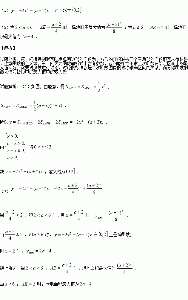 (本小题满分12分).如图,有一块矩形空地ABCD,要在这块空地上开辟一个内接四边形EFGH为绿地,使其四个顶点分别落在矩形的四条边上.已知AB=a(a>2),BC=2,且AE=AH=CF=CG,设AE=x,绿地EFGH面积为y.