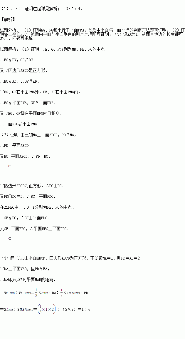 在如图所示的几何体中,四边形ABCD是正方形,MA⊥平面ABCD,PD∥MA,E、G、F分别为MB、PB、PC的中点,且AD=PD=2MA.