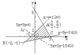 当直线ll0的右上方时,l上的点(xy)满足3x+5y>0,即t>0,而且,直线l向右平移时,t随之增大,在可行域内以经过点A()的直线l1所对应的t最大.