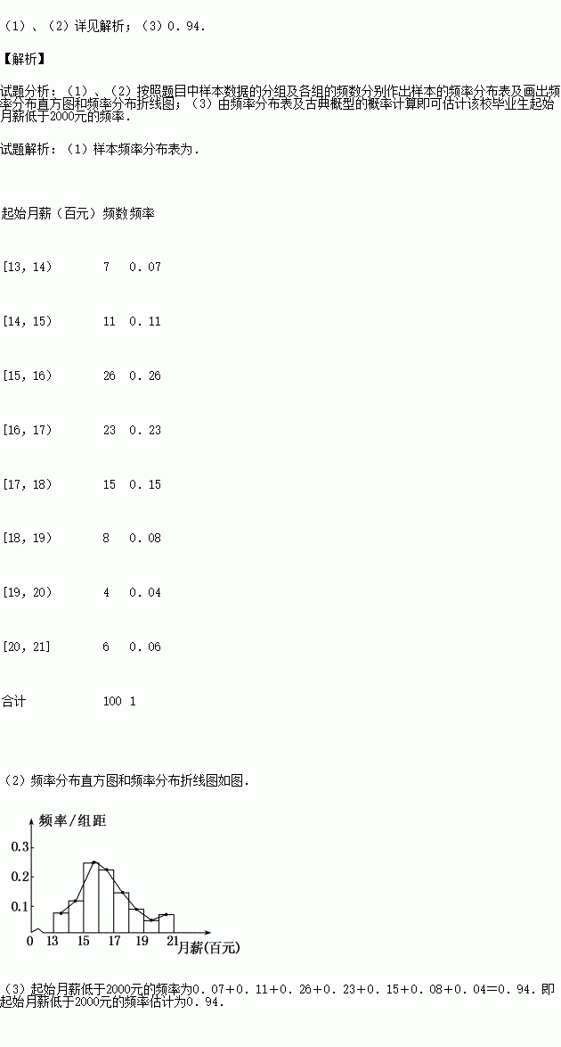 (3)根据频率分布估计该校毕业生起始月薪低于2000元的频率.