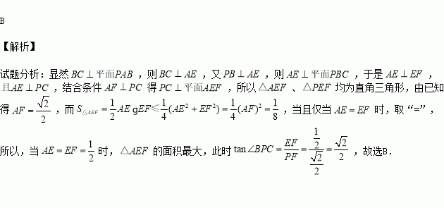 《九章算术》中,将四个面都为直角三角形的四面体称之为鳖臑,如图2,在鳖臑PABC中,PA ⊥平面ABC,AB⊥BC,且AP=AC=1,过A点分别作AE 1⊥ PB于E、AF⊥PC于F,连接EF当△AEF的面积最大时,tan∠BPC的值是( )