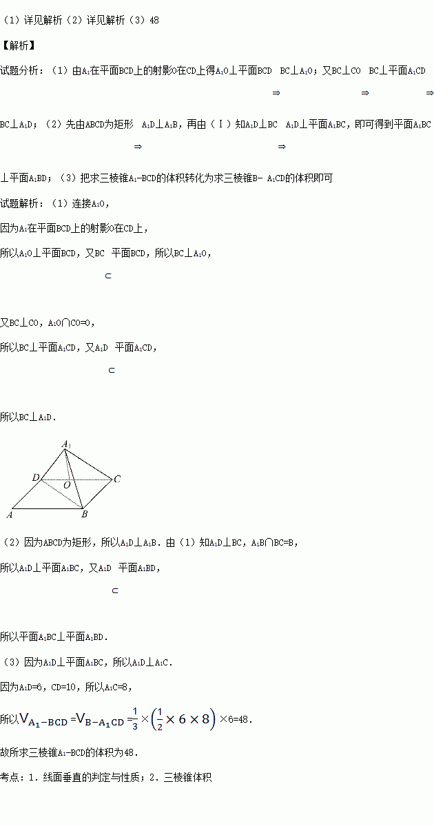如图,已知矩形ABCD中,AB=10,BC=6,将矩形沿对角线BD把△ABD折起,使A移到A1点,且A1在平面BCD上的射影O恰好在CD上.